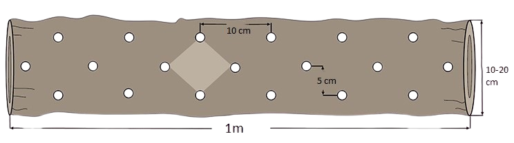 Gręžkite skyles gyliu pagal rombo modelį (paveikslas apačioje), maždaug 50 skylių viename rąste. Kaišteliams reikia 6 mm skermens grąžto, o pjuvenoms paprastai reikia 12 mm.
